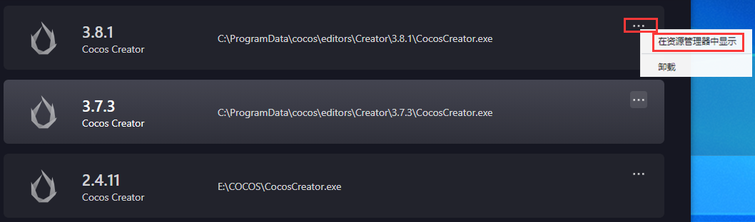 然后我们可以通过引擎右边的···选择在资源管理器中显示打开我们Cocos安装到的目录,然后找到我们的模板文件: