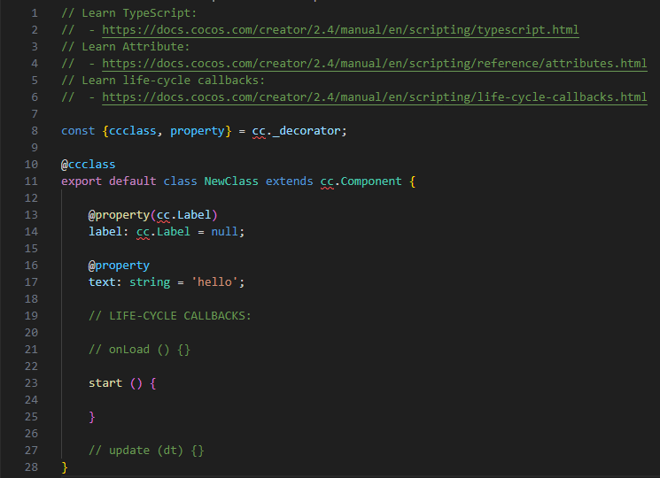 都会有一些我们不需要的一些内容生成,如顶部的一些学习导航、中间默认的cc.Label和string属性,还有我们可能会用到的onLoad和update方法。每次我们都需要手动去删掉这些内容,对于有强迫症的小伙伴来说,真是苦不堪言。