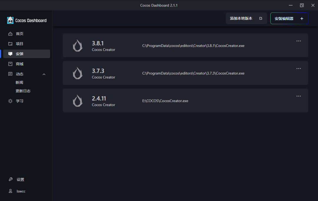 首先我们可以打开我们的仪表板Cocos Dashboard,在里面我们可以清楚地看到我们电脑上安装的所有的Cocos版本: