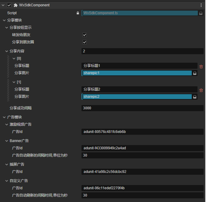 其中分享模块和流量主广告模块相关配置可视化调整。