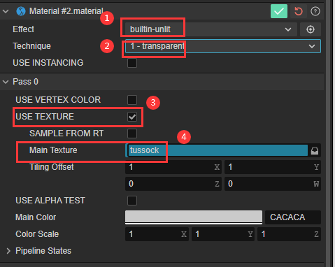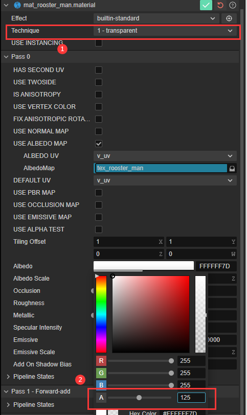 setModelTranslucency(flag: boolean) { const material = this.node.getChildByName("rooster_man").getComponent(RenderableComponent)?.sharedMaterials[0]; // 0 表示第一个材质,根据您的需求修改 material.setProperty('albedo', new Color(255, 255, 255, flag ? 127 : 255));}
