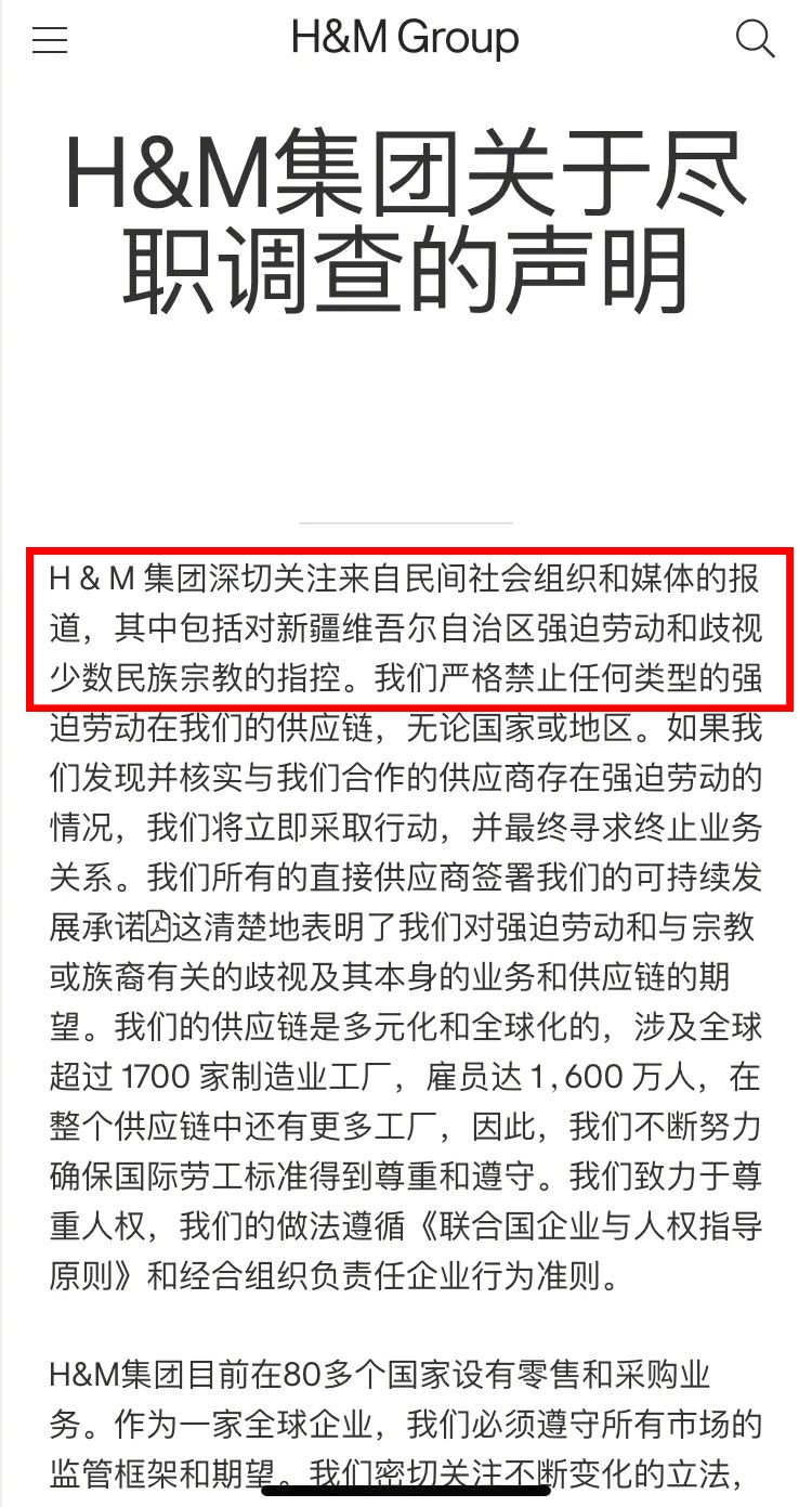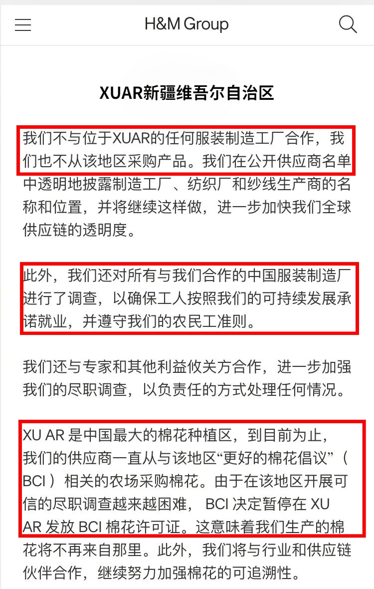 声明中,H&M集团表示,“我们不与位于新疆的任何服装制造工厂合作,也不从该地区采购产品/原材料”。