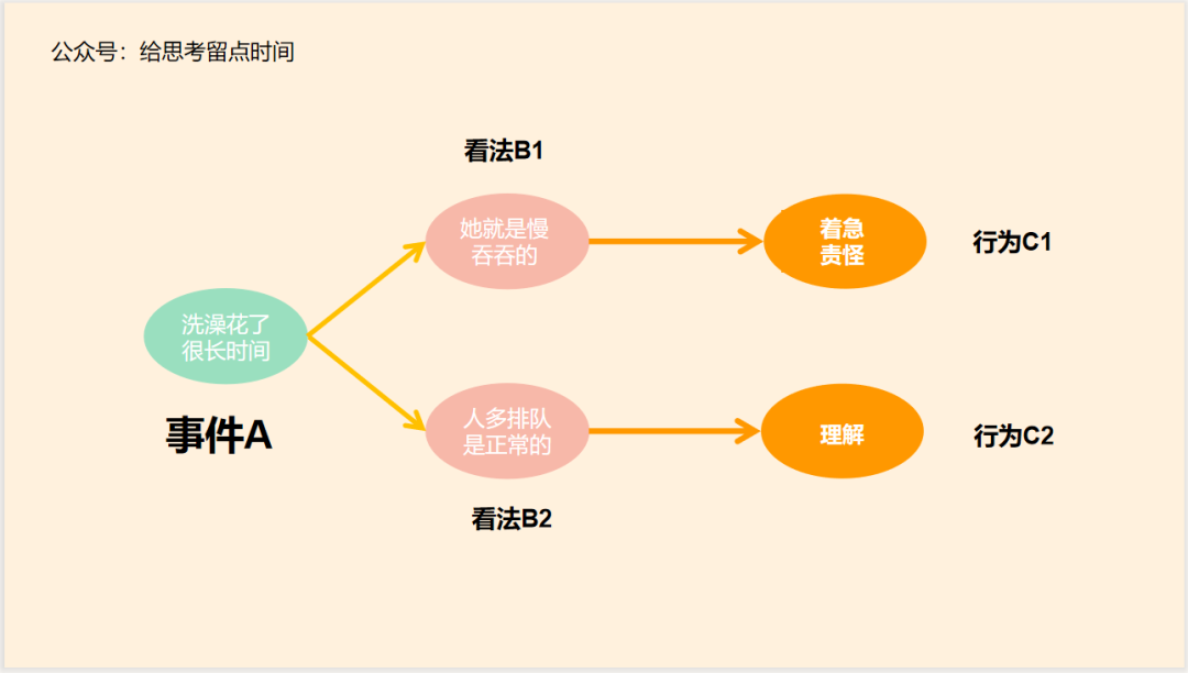 从这个案例来看,对于同一件事情(洗澡花了很长时间),当时我的着急和质问是行为C1,仔细了解事情经过后,理解她并接受事实是行为C2,而当时认为她慢吞吞是看法B1,后面认为这是正常情况是看法B2。
