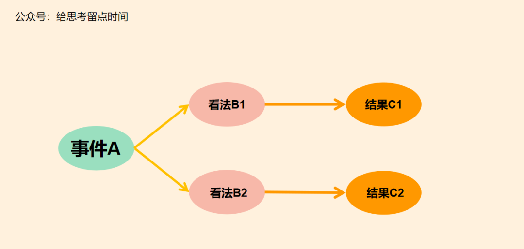 如图中,A指事情的前因,C指事情的后果,有前因必有后果,但是有同样的前因A,产生了不一样的后果C1和C2。