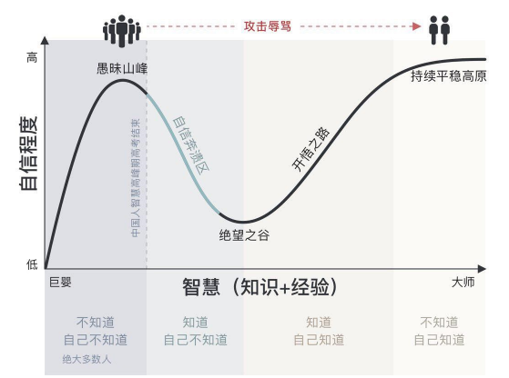 这时候,一个人就登上了所谓的愚昧之巅,站在这个山峰的人,往往会自我感觉良好,觉得人生已经到达了巅峰,可以肆意评价专家的水平和作为。
