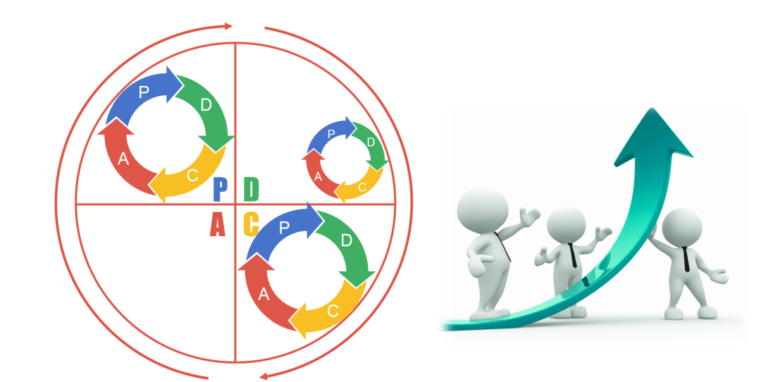 比如说公司里,各级部门根据自己的方针目标,都有自己的PDCA循环层层循环,形成大环套小环,小环里面又套更小的环。