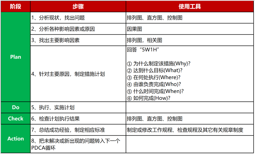 如下图所示,PDCA工作法4个阶段,可以拆分出8个步骤,每个步骤都有相应的工作和工具方法。
