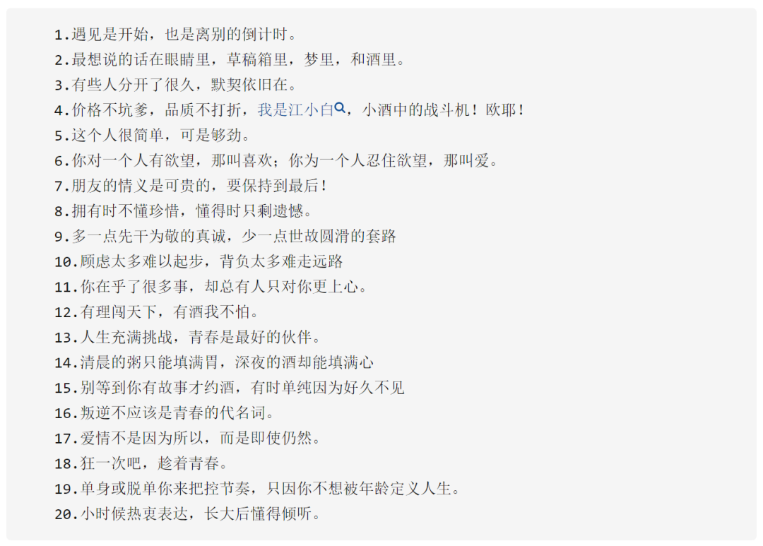 这就是江小白能打动年轻人的地方,利用巴纳姆效应,成功的酒类这个红海中,切走了最有潜力且最有议价空间的一批用户。