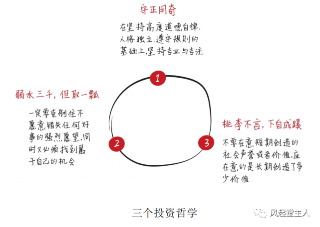 张磊在自己投资思想和哲学的集大成之作《价值》一书中,系统地阐释了价值投资理念,他将优秀的中国哲学思想和传统民族文化,与源于西方的现代金融投资工具和方法相结合,提出了张磊自己的三个投资哲学:“守正用奇”“弱水三 千,但取一瓢”“桃李不言,下自成蹊”。