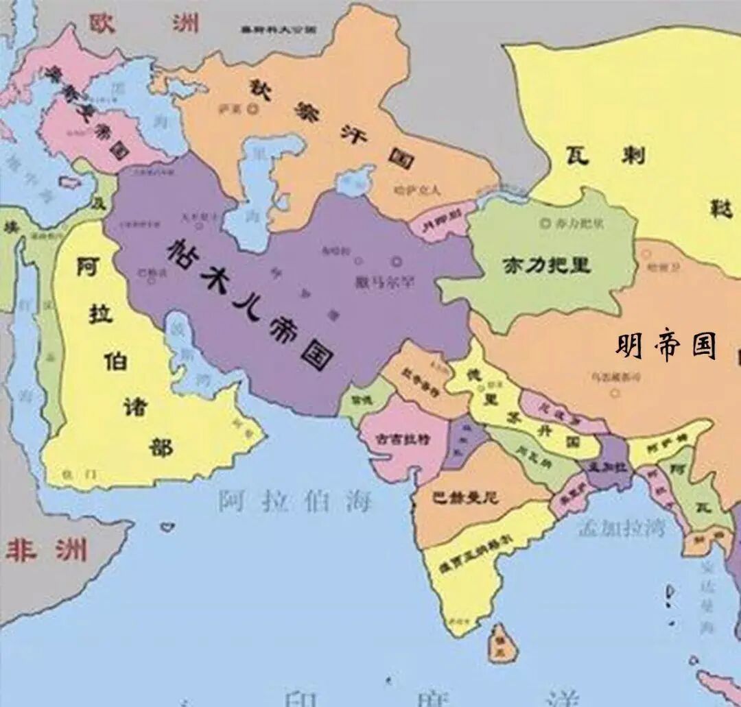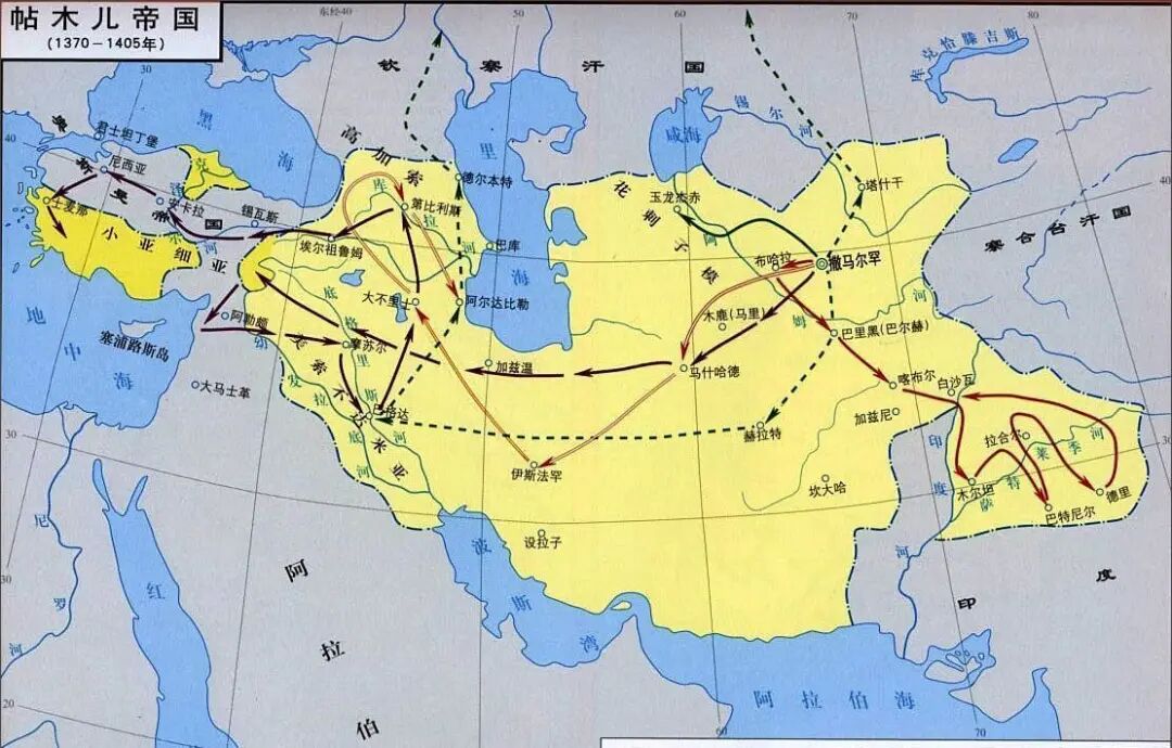 公元1370年到公元1502年,中亚地区又成了强大的帖木儿汗国的地盘。帖木儿汗国曾经打算挑战朱棣时期的明朝,差一点儿就打起来了。