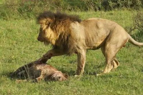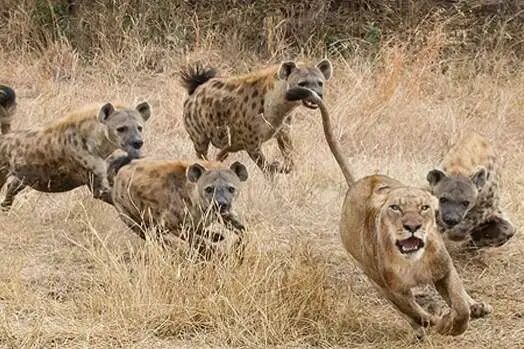 第四,可是狮子一旦被鬣狗围住,为了避免被掏肛,只能坐在地上,所以就无法进攻 。进攻面前的,后边的立马上去咬屁股,所以落单的狮子遇到鬣狗群,根本没有胜算,除非壮年雄狮。为什么狮子被掏肛的少,因为狮子比野牛聪明 ,很少会落单。即使被围住,也很快会有同伴来解救,只要有两只狮子 ,鬣狗群就围不住,因为一只可以保护,另一只就可以进攻。
