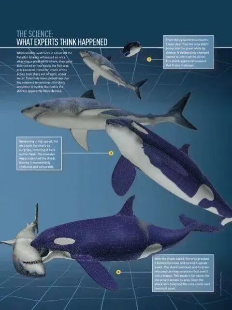 ②首先,虎鲸的头部结构比鲨鱼的完美,眼睛在嘴巴后面,更适合冲撞撕咬而不怕伤到眼睛,且虎鲸牙齿更大更坚固。其次,我觉得嘴部也有影响,虎鲸的嘴长在前面,张开嘴就能咬,大白鲨嘴部在下面,要咬虎鲸还需要仰头或者侧身,在首轮攻击时就失去了先机。另一方面,科学研究表明,虎鲸在集体捕猎时,有一大部分虎鲸之间的交谈是在骂队友,这和我们人类工作中互相攀比炫耀自己能力,谩骂其他人无能力,或者吹嘘自己,这说明虎鲸是一种高度智力集成下拥有荣辱观感情的动物,拥有这种智商的动物已经拥有灵魂了。