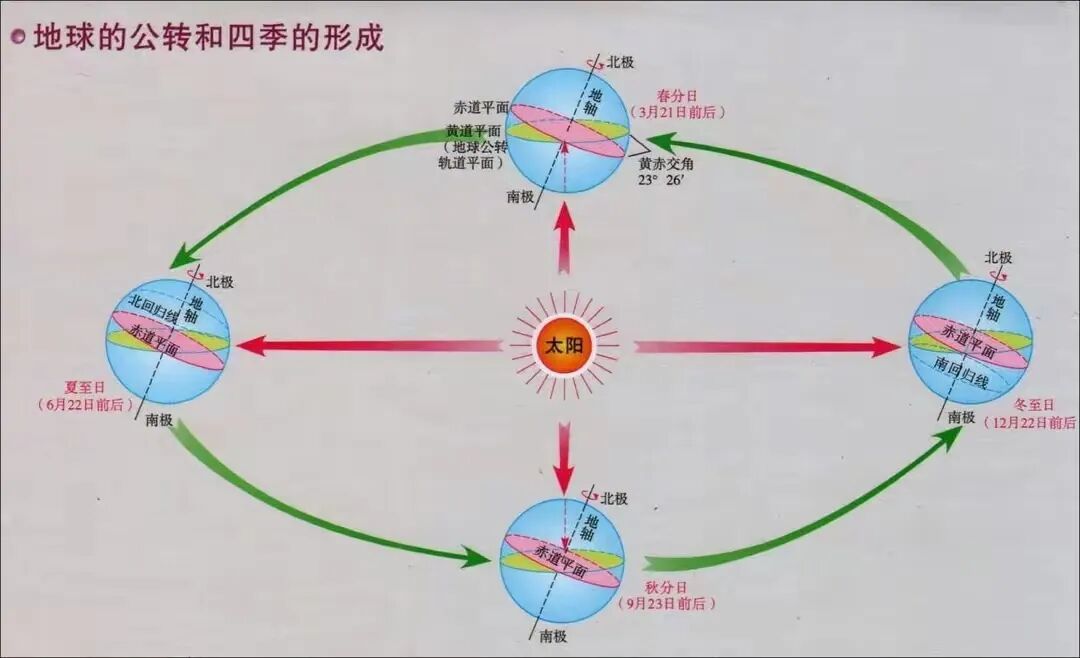 第五,形成四季的主要原因,最简单的说,与日地远近关系不大,光的直射和偏射才是根本原因。直射吸热多,偏射吸热少,而造成直射和偏射的主要原因是地球自转轴的23,26度的斜角。除此之外,地球重时向太阳靠近,地球就进入了太阳热的一面,地球轻时向宇宙冰层靠近,地球就进入了冷的一面,冷时一段时间地球又慢慢变重了,热时一段时间地球又慢慢变轻了。