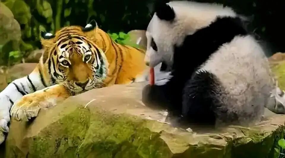 ⑤老虎不吃熊猫是因为一者熊猫会上树,二者不认识,每种兽种都有自个地盘的,三者野生物种不是你看到那样的,其实猫科动物生性多疑且胆小,没有绝对把握是不会轻易出击的。