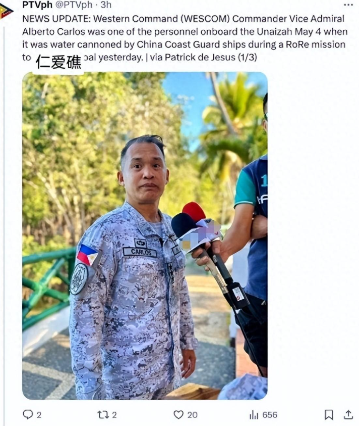 身为菲军方高层,卡洛斯为何会出现在菲海警一线?对此卡洛斯称,他只是想指挥“尤娜扎·五月”4号“测试一下能否闯入仁爱礁海域”,但这艘船并未搭载任何补给物资,完全可以被视作一艘“空船”。结合菲方过往行为,这种说法很难让人信服。
