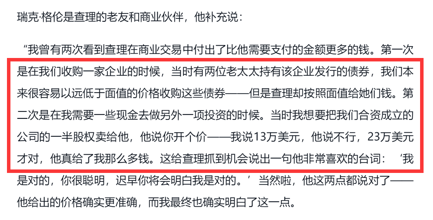 芒格在这里多花10万美元,而这个案例在投资圈传播来开,会有更多的人愿意把股票卖给芒格。这两者谁的利益更大?当然是后者。