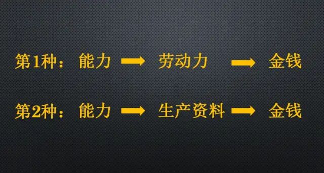 即能力转化为劳动力,用劳动力去交换金钱。或者能力转化为生产资料,用生产资料去交换金钱。