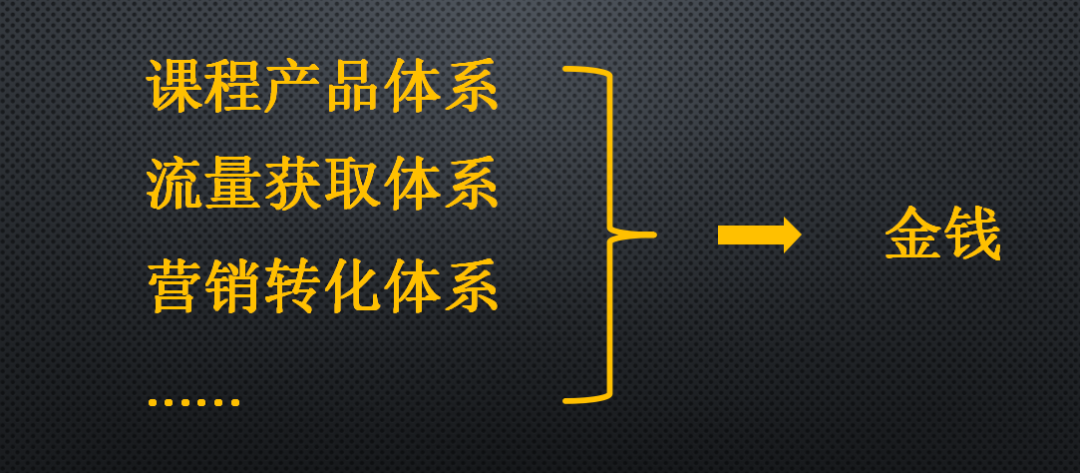 三个环节其实是三个生产资料,课程产品体系、流量获取体系、营销转化体系。有了课程,你只需要再搭建起另外两个,把三者组合在一起,就能交换金钱。