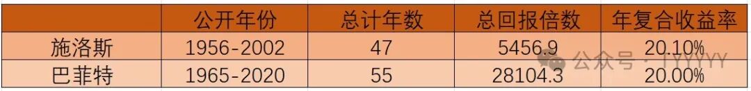 巴菲特和施洛斯都有近50年的公开投资记录,我们看一下巴菲特和施洛斯的年化收益对比: