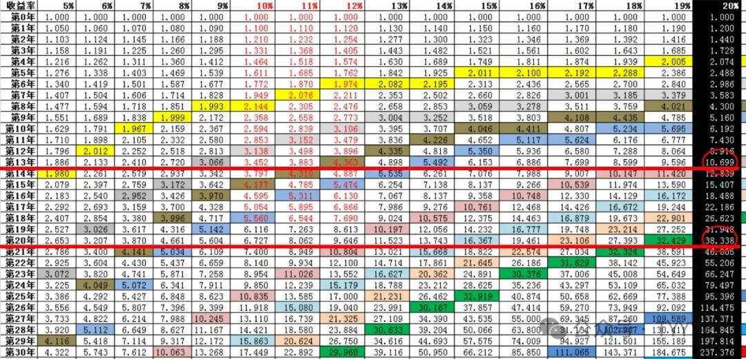 在近50年的时间里,施洛斯和巴菲特的年化收益几乎一样,都是20%。如果你觉得20%的年化收益过低,那你没必要往下看了,价值投资不适合你,你比较适合投机或赌博。20%的年化收益复利13年能翻十倍,复利20年约38倍。复利收益计算表: