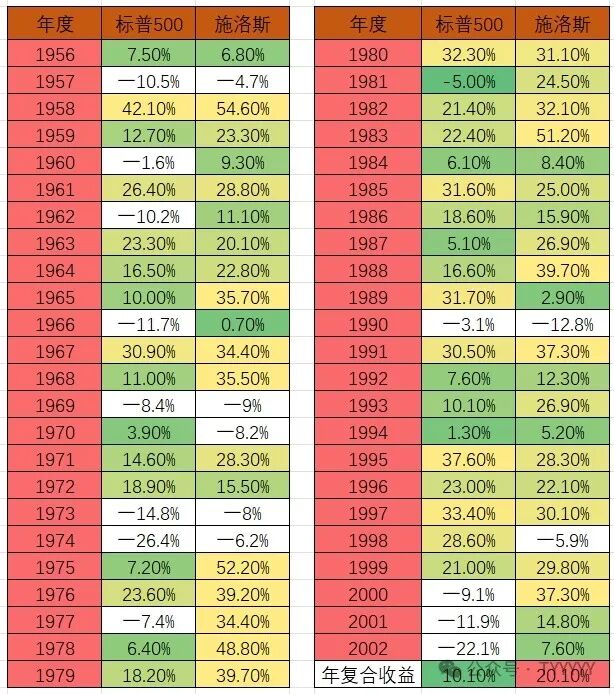 从1956年至2002年漫长的47年,标普500的年化是10%,施洛斯年化达到了惊人的20%。
