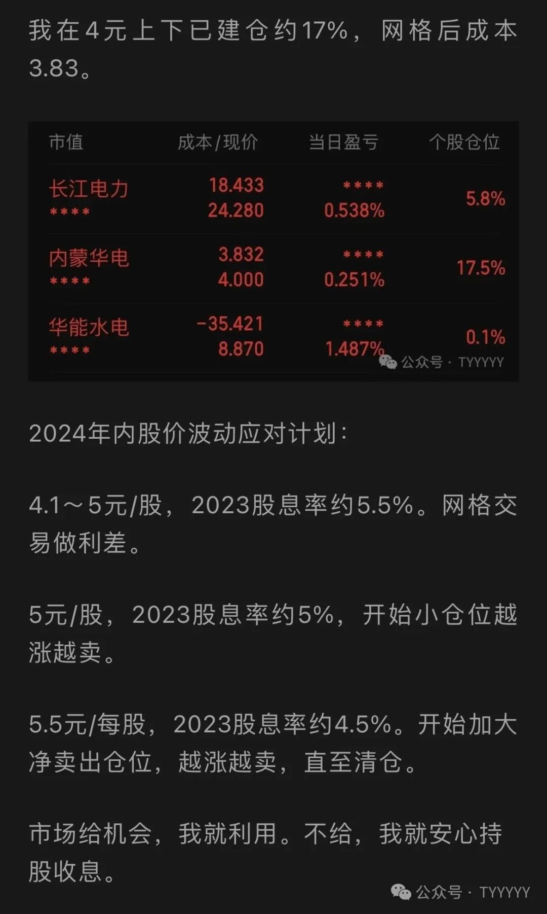 我在4.05元/股以下一直加仓,网格分批买入,从4.2元开始每涨约0.1元减仓1次,跌约0.1元加仓1次。发文当天成本是3.83元/股,现在成本是3.61元/股,现在盈利约27%。