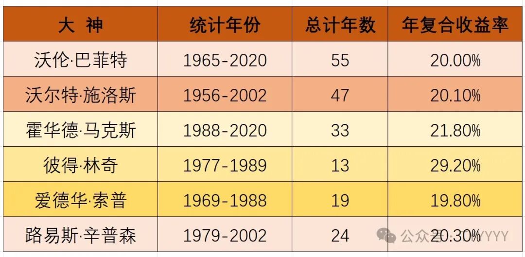 除了彼得·林奇高达29.2%,另外几位大神的收益率都是约20%。不过林奇的公开交易数据只有13年,这个数据参考意义要打折哈。而且林奇在这13年时间里把自己生生干成了满头白发,累到自己都干不下去,主动关闭了基金,算是多劳多得吧~