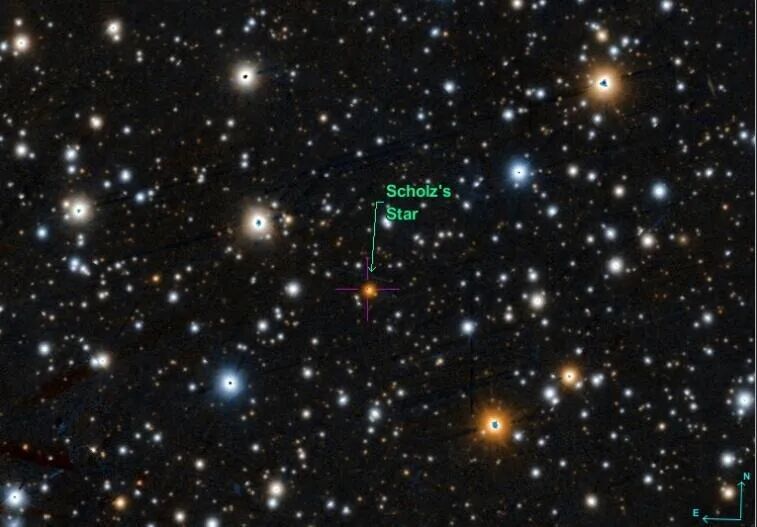 “WISE 0720-0846”在天空中位于麒麟座方向,目前与我们的距离大约为22光年,由天文学家拉尔夫-迪特·舒尔茨(Ralf-Dieter Scholz)于2013年通过“广域红外线巡天望远镜”(Wide-field Infrared Survey Explorer, 简称WISE)发现,因此它也被称为“舒尔茨之星”(Scholz's Star)。