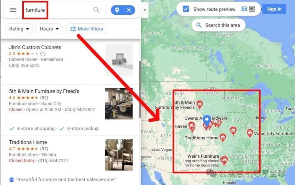 搜索关键词+Location:在谷歌地图中搜索关键词加上特定地点,如“家具采购商+广州”,即可找到该地区的家具采购商。