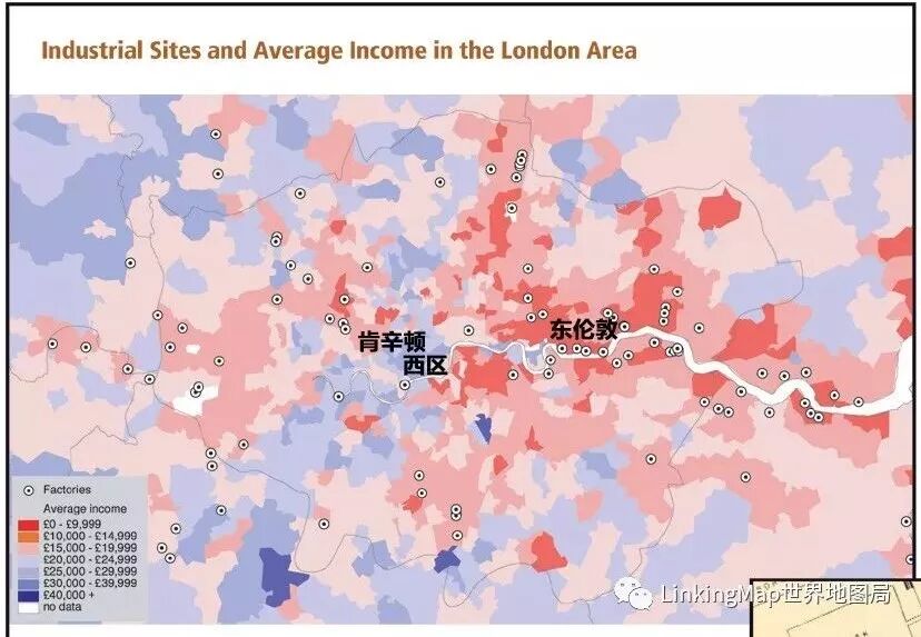 伦敦城市存在西富东穷的现象,王室所在地、知名人士豪宅均位于肯辛顿(Kensington)、为代表的西伦敦。而东伦敦在历史上是码头、工厂的所在地,外来移民、工人聚居在此。