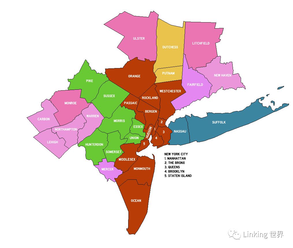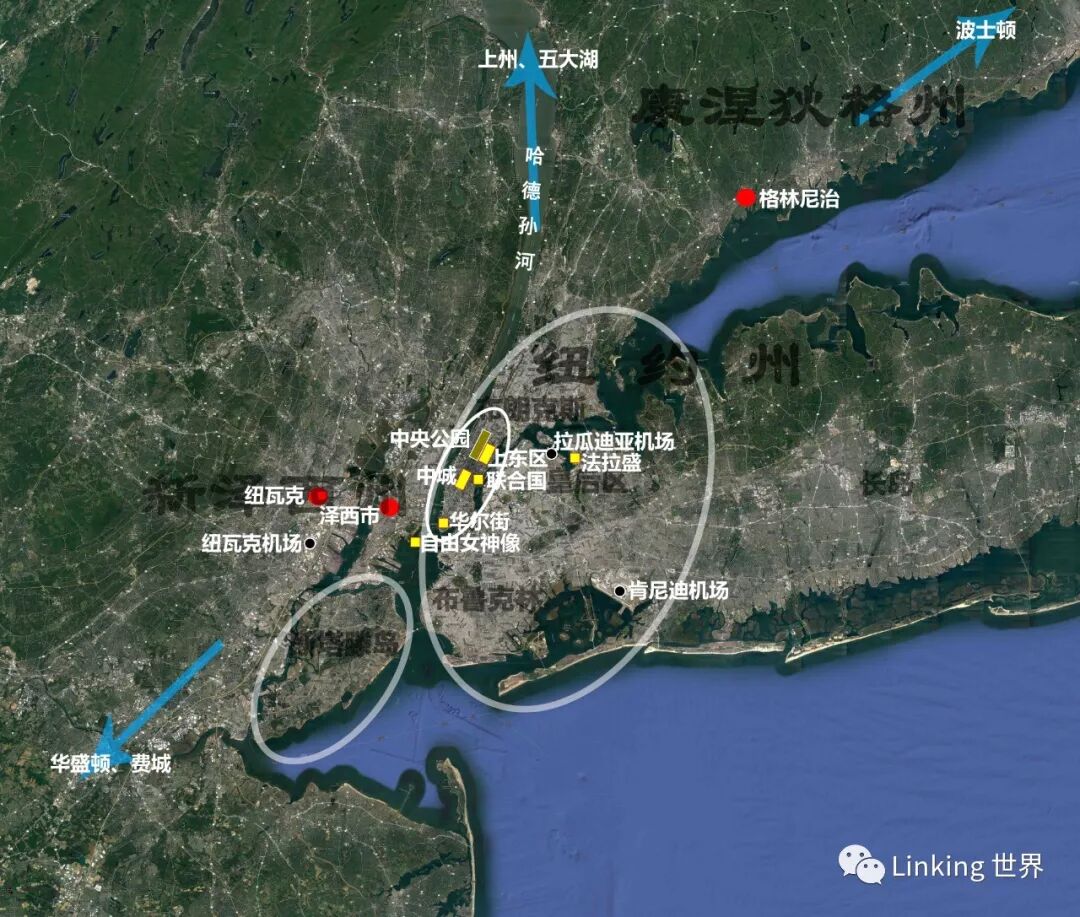 纽约是人类历史上第一个人口超过1000万的城市,早在20世纪20年代,纽约城市蔓延就已经越过了市界,扩展到了长岛地区和新泽西州。今天的纽约都市圈人口达到2000-2500万,成为发达国家中少数在人口规模上可以跻身为世界前列的城市地区。今天纽约都市圈延伸到了新泽西州、康涅狄格州,甚至到了宾夕法尼亚州,这些州形成了一系列依托纽约发展起来的卫星城:泽西城、纽瓦克、格林尼治。