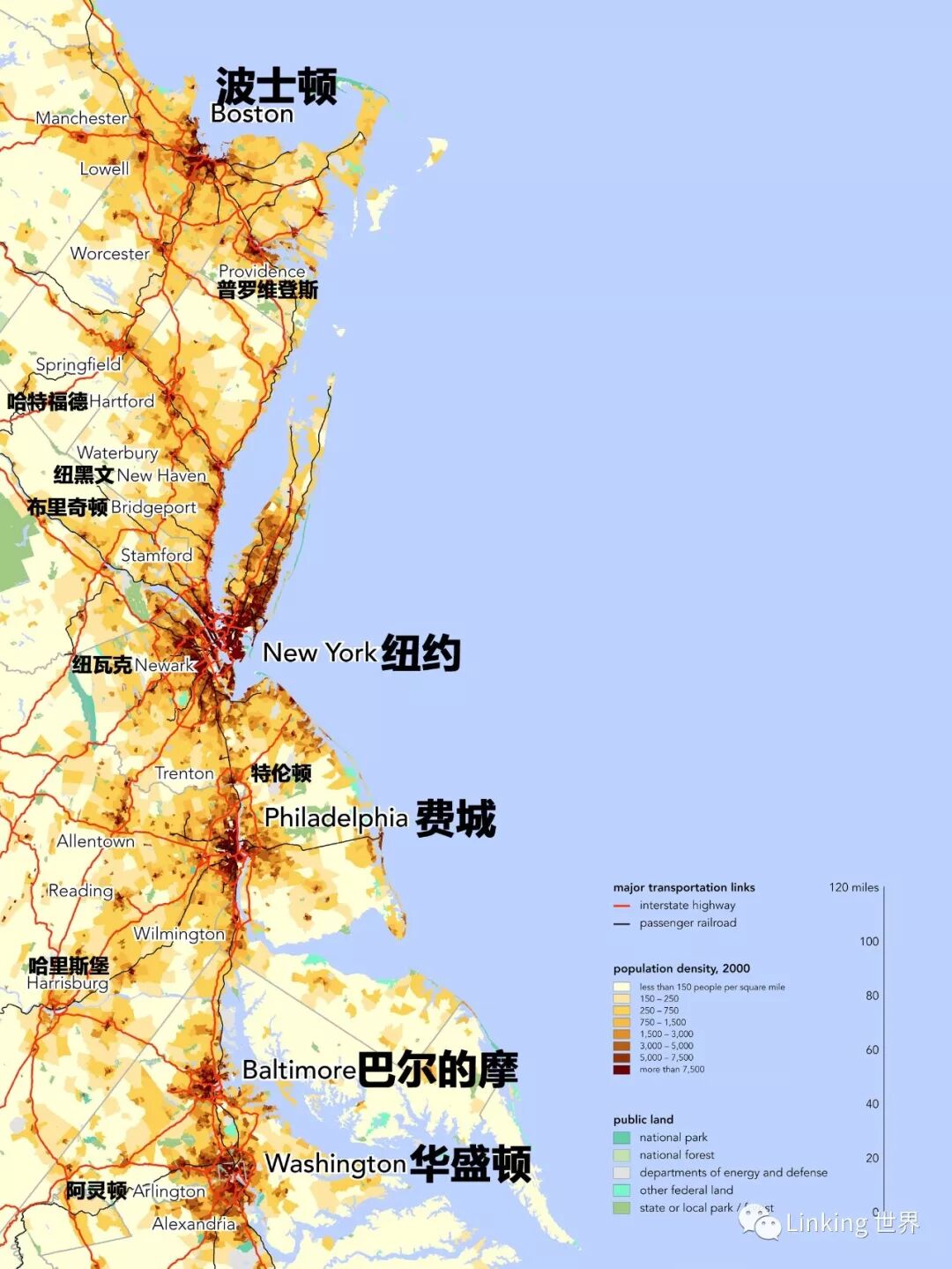纽约依靠美国而繁荣,也依靠富饶的美国东北部的大西洋沿岸而成为国家的枢纽。纽约周边拥有华盛顿、波士顿、费城等诸多现代化大城市,彼此之间交通、通信联系紧密,城市建设也消融了相互的界线,形成了第一个现代意义上的城市群。这个城市群横跨11个州,人口超过5000万,占美国的17%,而面积只占2%。