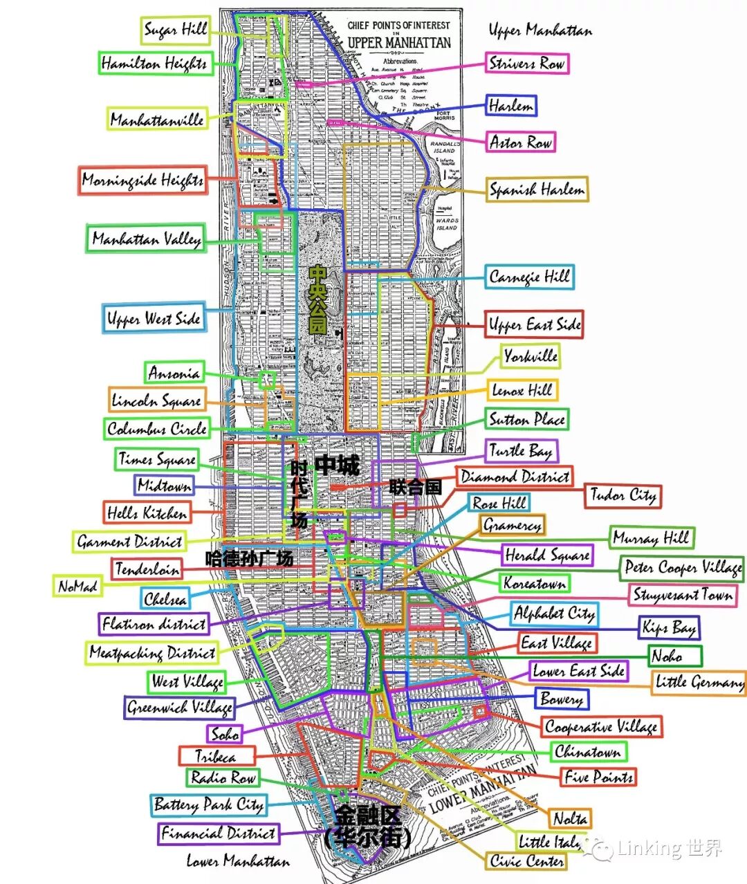 作为世界上知名度最大的城市,纽约内部许多的地名也非常著名,比如曼哈顿、华尔街、中城等。曼哈顿是纽约乃至整个世界的金融和商务中心,集中了大量的本国和国际公司办公室,一个小小的岛屿贡献了全美国20%的办公空间。曼哈顿有两大商务中心:下城的华尔街和中城地区,如今哈德孙广场也逐渐崛起为新的商务中心。
