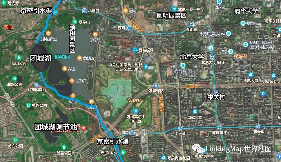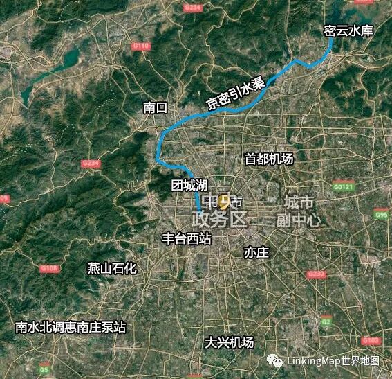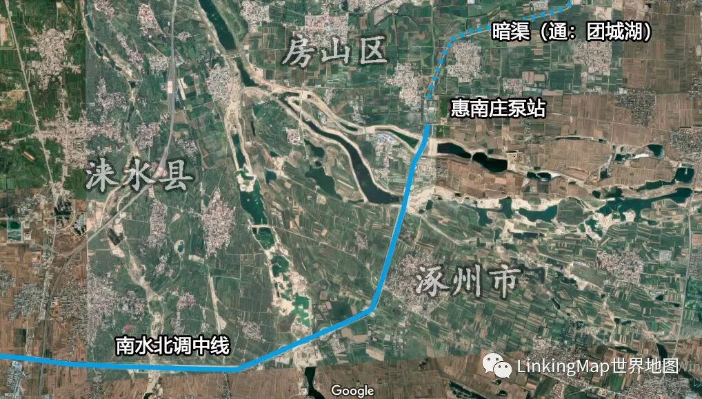 京密引水渠从密云水库引水,经怀柔水库、团城湖流至永定河引水渠,相当长的时间里是北京主要的供水输送路径。南水北调竣工后,南水逐渐取代密云水库成为北京生活用水的主力,并通过京密引水渠反向输水至怀柔水库、密云水库进行调蓄。团城湖是密云水库南下和南水北调北上的枢纽,设有南水北调团城湖管理处。南水北调进北京时会经过房山区惠南庄泵站,南水北调中线从这里开始由明渠变为暗渠,流向团城湖。该泵站是南水北调中线干线工程唯一的一座大型加压泵站,是北京段实现小流量自流、大流量加压输水的关键控制性建筑物,也是南水北调中线干线工程的标志性建筑物。