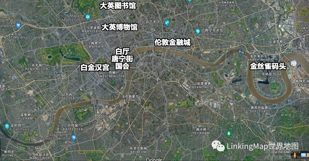 伦敦政务功能地标,如王宫、首相府(唐宁街10号)、内阁机构(白厅)、国会位于西部的威斯敏斯特城(City of Westminster),商务功能位于东部的伦敦市(City of London)、金丝雀码头地区。伦敦城市因伦敦市而得名,但实际上伦敦作为首都的功能,更多体现在威斯敏斯特城,这是一个与伦敦市一样的具有“城市”(City)地位的单元。