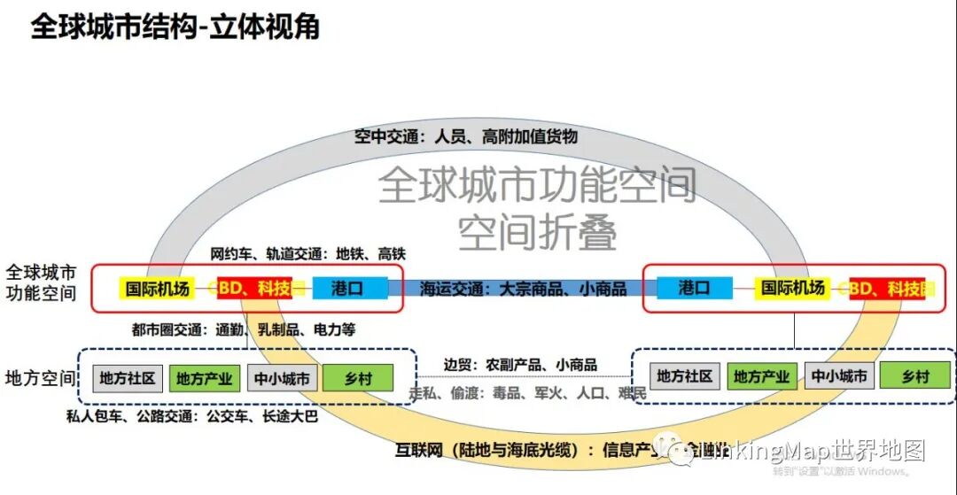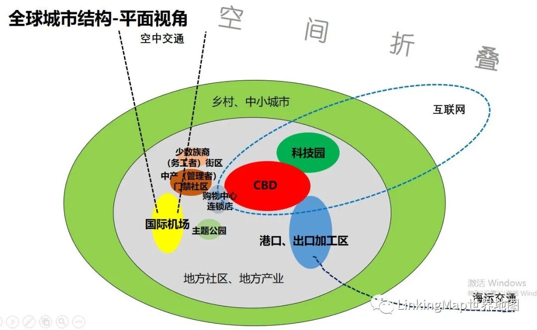 全球城市是全球化要素资源流动形成的空间,彼此通过天空、海洋等方式相互联系,成为地方与全球体系衔接的出入口。虽然这些城市在某些方面与遥远的同类城市的联系甚至要明显多于周边的中小城市、乡村,但实际上任何一个全球城市的发展都离不开它们与周边腹地的联系。全球城市往往是周边腹地工农产品的集散地、周边企业的服务中心,或者是依托周边腹地的劳动力而形成的出口加工区。也许这个腹地并不是紧贴着城市周边的地区,但也不会离得太远。全球城市本身就是一个联系全球与本地社会的中介,作为发挥这个中介的功能空间,国际机场、涉外社区、出口加工区、CBD是全球城市必不可少的组成部分。全球城市的航空、互联网、海运的联系规模远远高于周边地方功能突出的中小城市,中小城市可能通过陆路交通与不远的城市或乡村发生着联系。但全球城市,尤其是那些CBD、涉外社区、国际机场等空间,直接通过天空的飞机和海中的光缆,与遥远的同类城市进行联系,而这一过程几乎完全不与周边城市或乡村联系。如同一张纸遥远的两端如果想连在一起,并不是在纸上画一条线,而是直接把纸折叠起来让两点接触。全球城市的空间联系,就如同这张纸,发生了空间折叠。