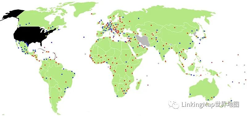 美国在全球大使馆、领事馆分布:主要集中在各国的首都和区域中心城市,此图包含了成都,现已关闭