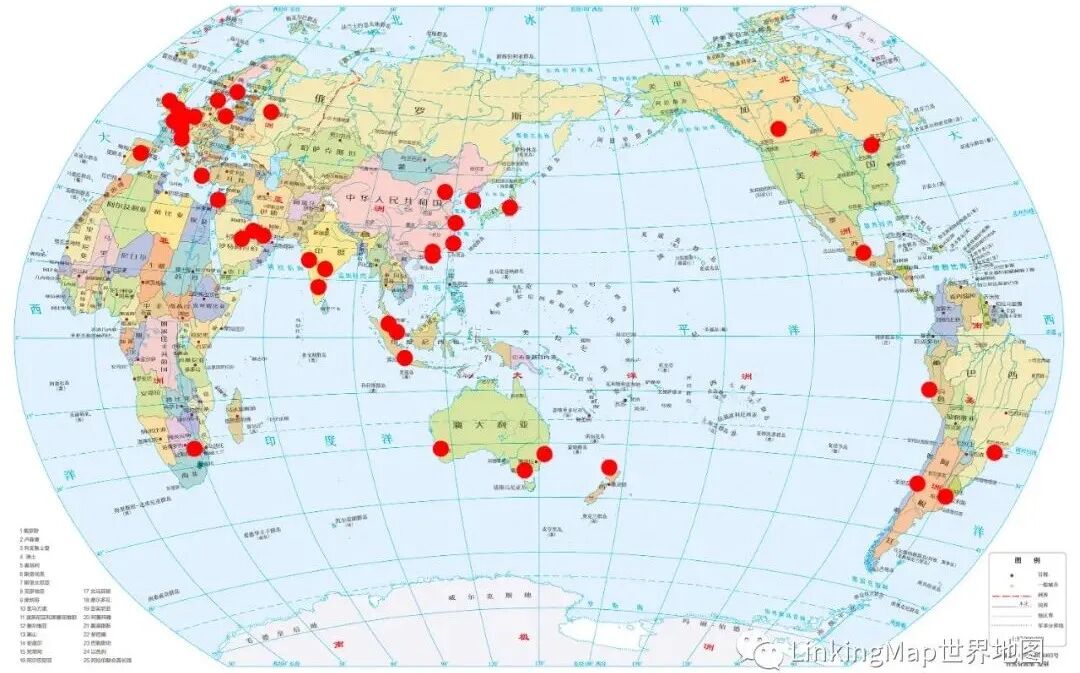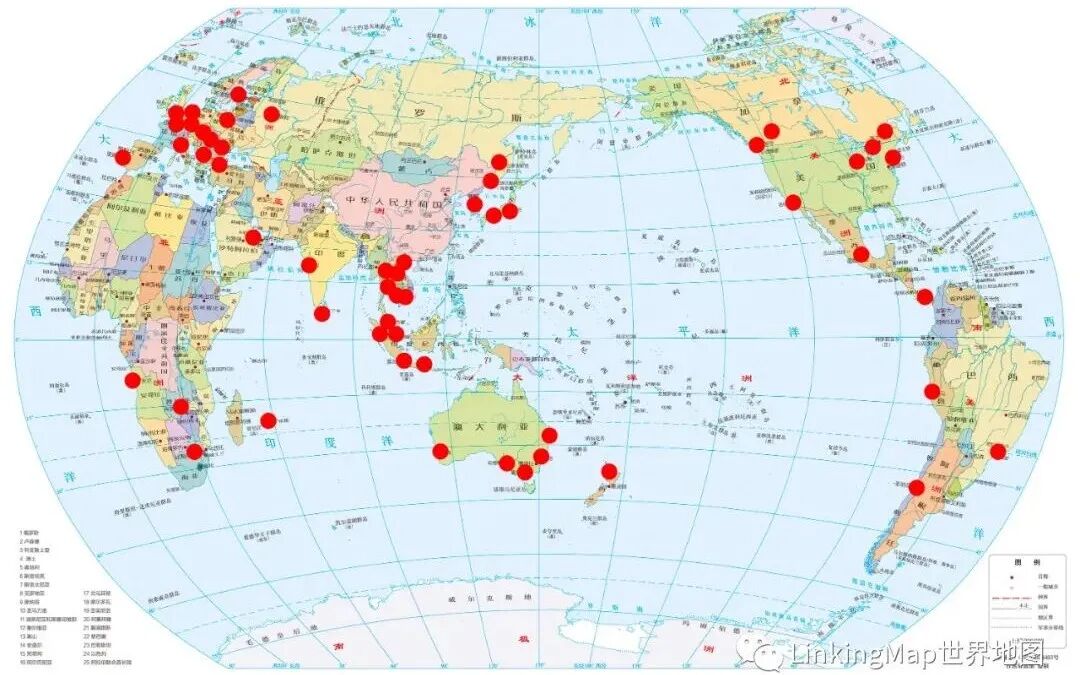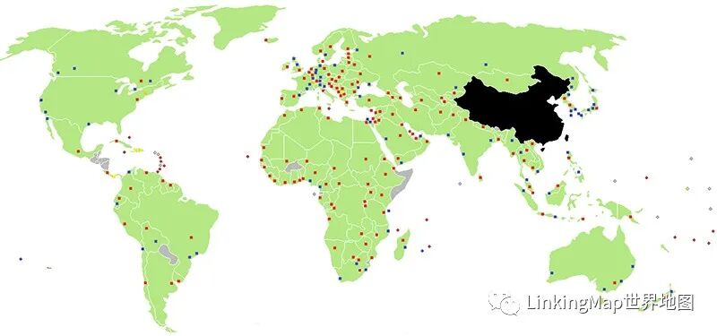 中国大使馆、领事馆全球分布情况,此图包含了休斯敦,现已关闭