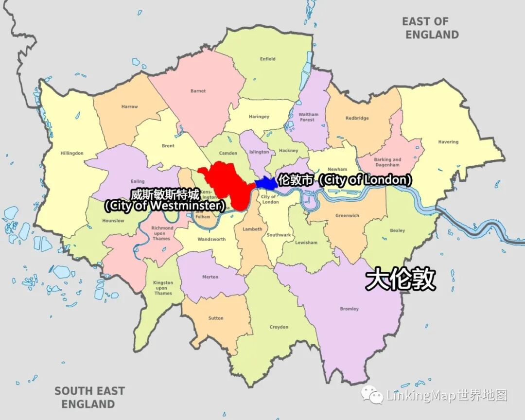 伦敦分区,以及威斯敏斯特城(City of Westminster)、伦敦市(City of London)位置
