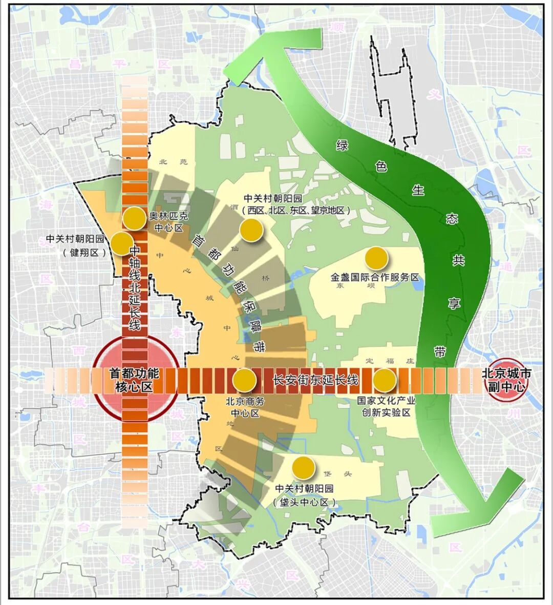 朝阳区是北京重要的商务、体育、外交活动集中区,延续历史上朝阳门一带作为京师商贸中心、南北通衢的功能,继续形成围绕北京首都功能核心区的商务、商业外围区