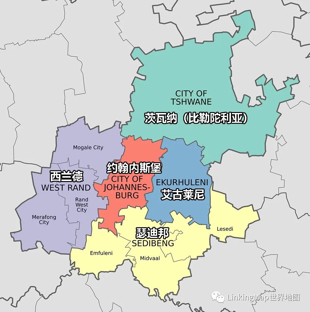 豪滕省行政区划:包括茨瓦纳(原比勒陀利亚)、约翰内斯堡、艾古莱尼三个大都会政区和西兰德、瑟迪邦两个普通政区。三个大都会政区人口规模在300-500万人,其他两个政区人口规模约100万。三个大都会政区体量接近中国一个中型地级市,两个普通政区接近中国一个稍大一点的县域