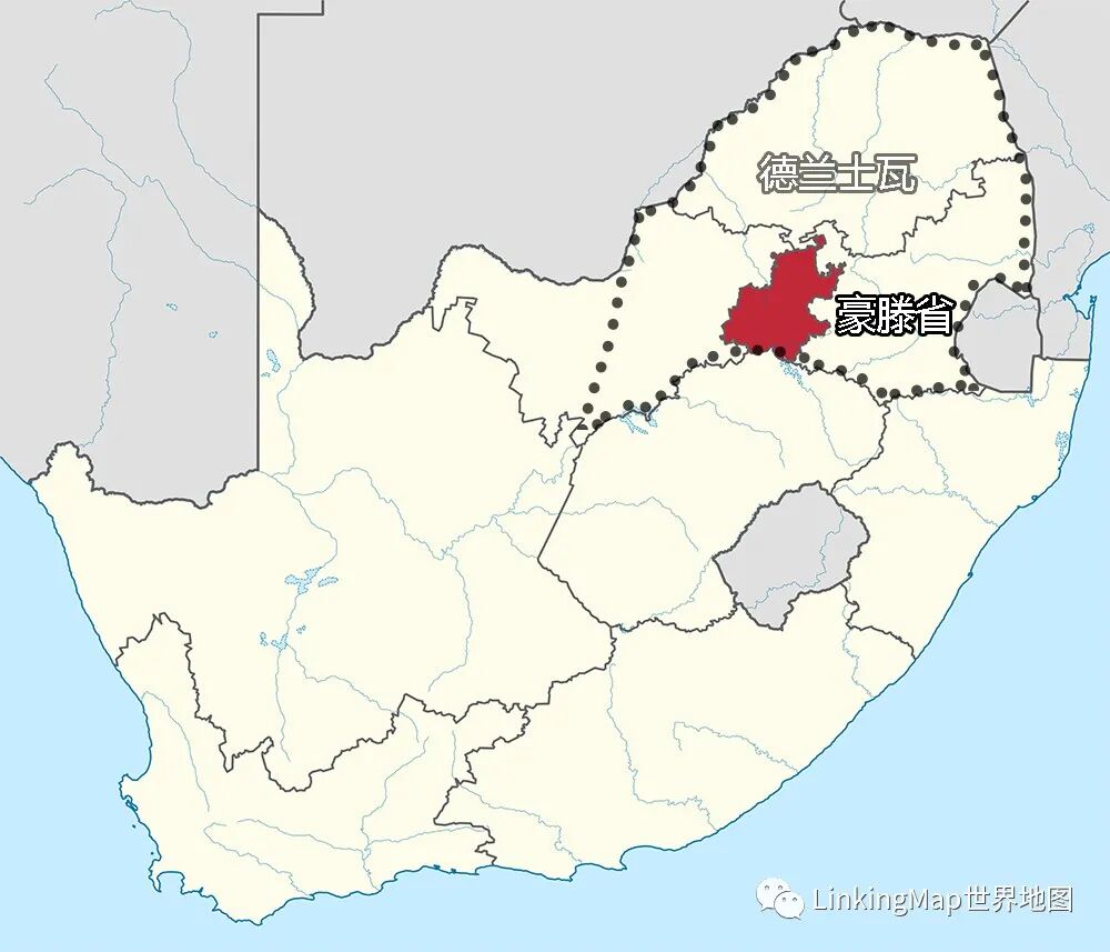 豪滕省在南非的位置,图中虚线为原德兰士瓦省的范围