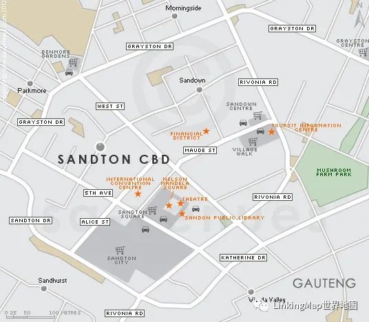 约翰内斯堡分区:约翰内斯堡人口约500万,面积1600平方公里左右,体量接近浦东新区,约翰内斯堡是豪滕省最大的行政区,是南非的工商业中心,目前城市的商务和商业中心从CBD地区转移到桑顿