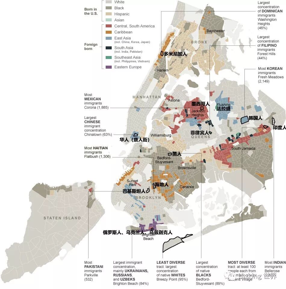 美国纽约少数族裔街区分布:移民在美国存在按族群聚居的分布特点,在主要大城市内部形成少数族裔街区,其内部拥有一定的自治特性,呈现出与其他街区完全不同的风貌
