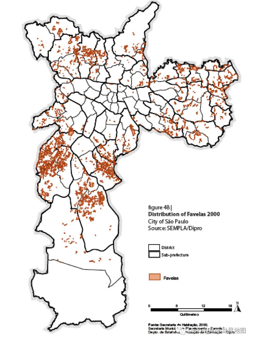 里约热内卢某地贫民窟与正式城市建筑的空间关系:主要分布在正式用地边上的山坡上,过去因为属于“荒地”,得以成为外来移民进行建设的空间。巴西以及拉美贫民窟的形成与拉美超前城市化有着很大的关系,大量农民破产,不得不进入城市,而城市无论是住房还是就业都不能满足这些移民,贫民窟和地下经济成为容纳移民的空间