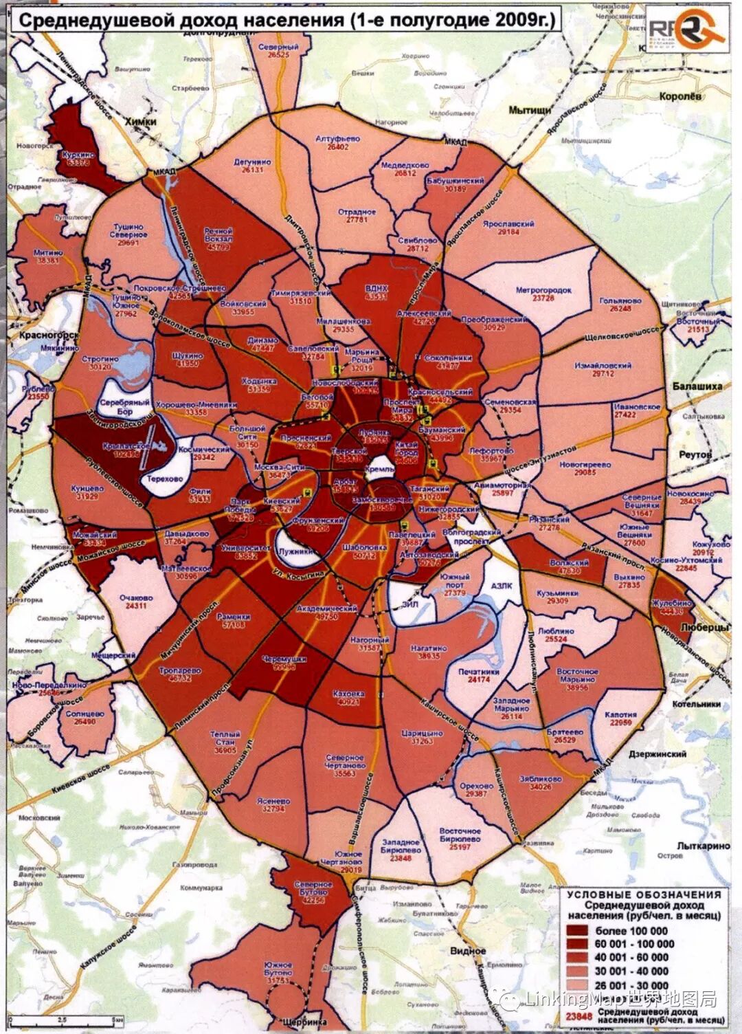 和世界上大多数城市一样,莫斯科内部也有着收入不平等的现象。西部城区的收入要高于东部。一些著名的大公司,比如俄罗斯天然气工业公司等都位于西部。莫斯科大学、莫斯科国际商务中心也位于西部城区。莫斯科东部主要是车站、绿地和文化设施等。