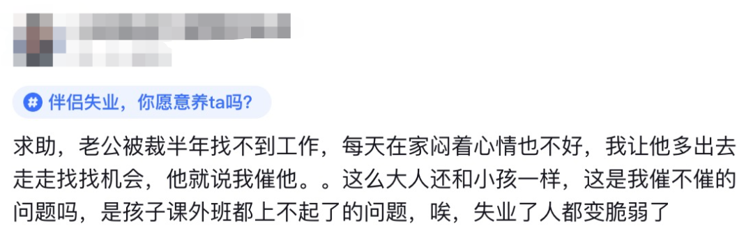 有网友抱怨,她的老公在大厂工作多年后突然被裁,接下来的半年里,一直没能找到合适的工作。这期间,他大部分时间都闷在家中,他还觉得被家人催促找工作给他带来了巨大的压力。
