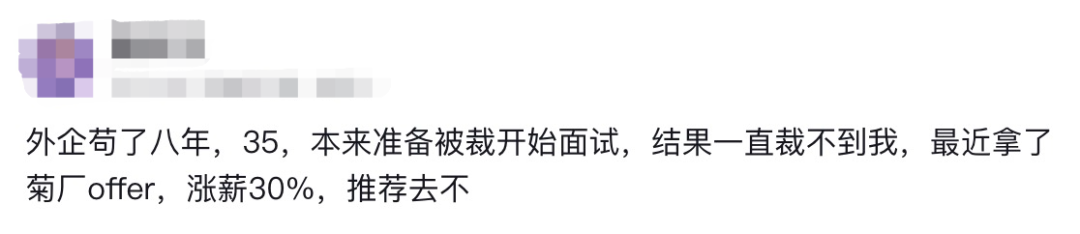 这年头,大多数职场人都提心吊胆,生怕哪天自己的饭碗不保。但这哥们儿呢,反而在等着自己能被裁,当然,如果他被裁能获得的赔偿,也是金额不菲,他在意那是理所应当的,而且,下家加班和压力大那是出了名的,如今已经35岁了,再去这么卷的企业,可能反而不如在外企呆着比较爽。