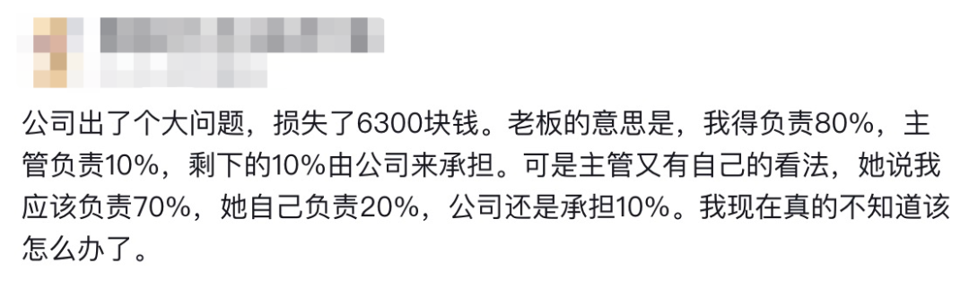 某大厂的员工吐槽,公司业务上出了问题,导致了6300元的亏损。老板的意思是,该员工得承担大头,负责80%的赔偿,主管承担10%,剩下的10%由公司来出。这时,主管站出来了,表示自己要多担一些,20%的责任他来,让员工承担70%,公司依旧是10%。