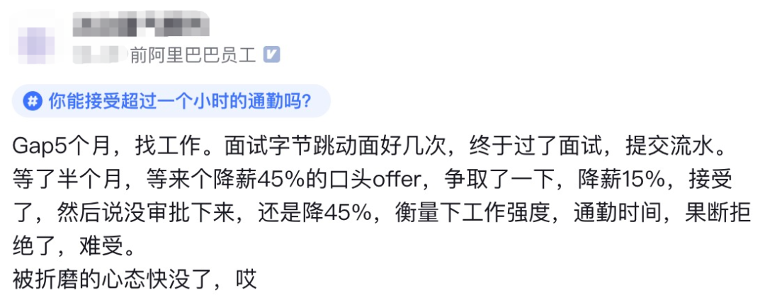 等了许久,得到的offer却比原薪水降了45%...他在权衡了工作强度和通勤时间后,最终还是决定放弃。